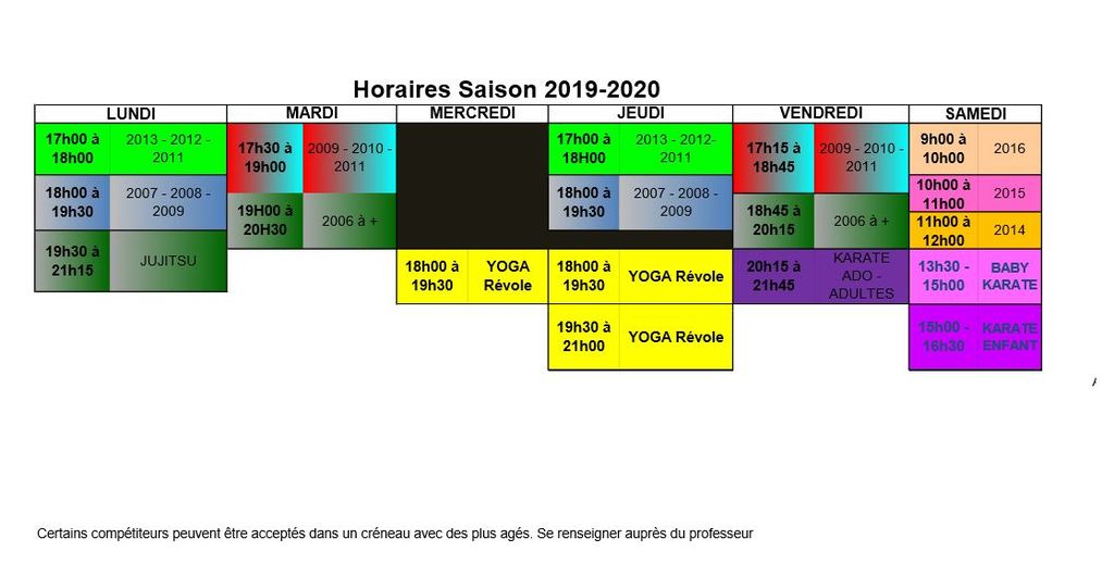 voici la planning de la prochaine saison ! A noter le changement de jour et d'horaires pour les baby karaté et karaté enfants